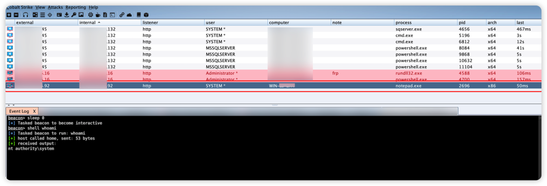 随后 MSF 和 CS 联动,我把 MSF 的 shell 又弹到了 Cs,并且做了权限维持: