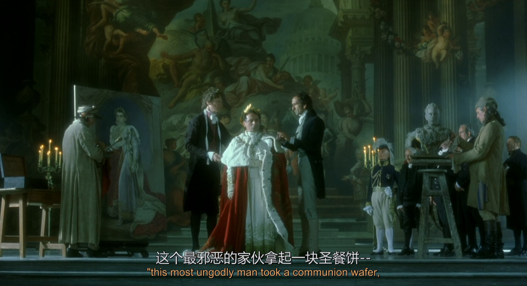 从这段的电影语言上就能看出王权在这里也是被嘲讽的对象。电影突出表现了拿破仑传说中的身高: