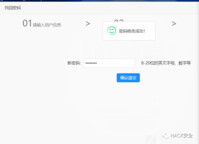 填入验证码,直接跳转到第三步修改新密码,填入新密码后,点击提交