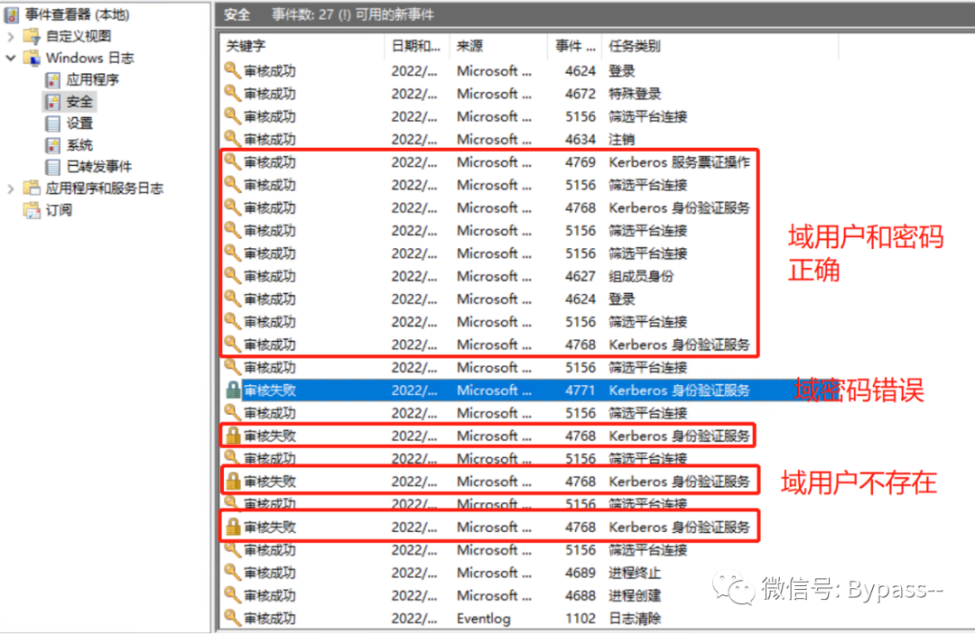 域用户存在,密码错误,会产生一条事件ID为4771(审核失败)的日志记录。