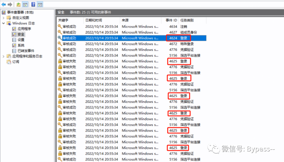 开启审核策略,Windows安全日志会产生相应的审核日志,帐户登录失败,事件ID为2625,账户登录成功,事件ID为4624。