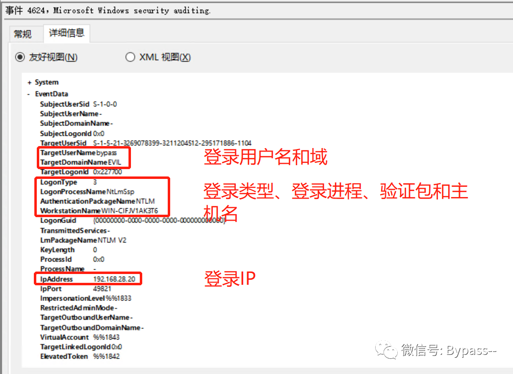 事件ID:4624 登录成功,包括登录的用户名和域、登录类型、登录进程、身份验证包、登录的计算机名和登录IP地址。
