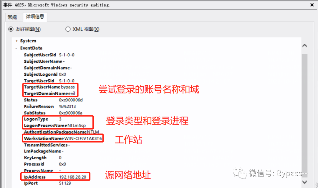 事件ID:4625 登录失败,日志里包含尝试登录的账号名称和域、登录类型和登录进程、登录的计算机名和登录IP地址。