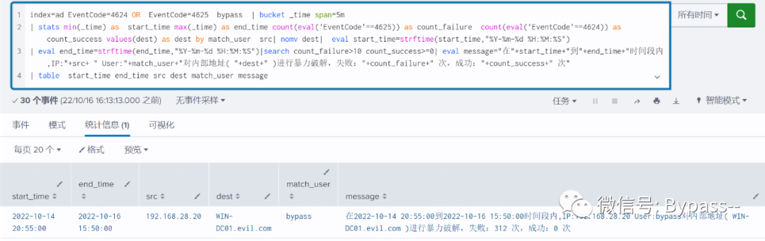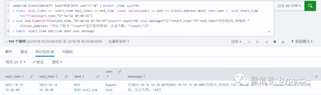 通过模拟环境产生攻击事件,以攻击日志构建规则,提取关键特征,设定简单的阈值,就可以实现实时检测域用户密码攻击行为。