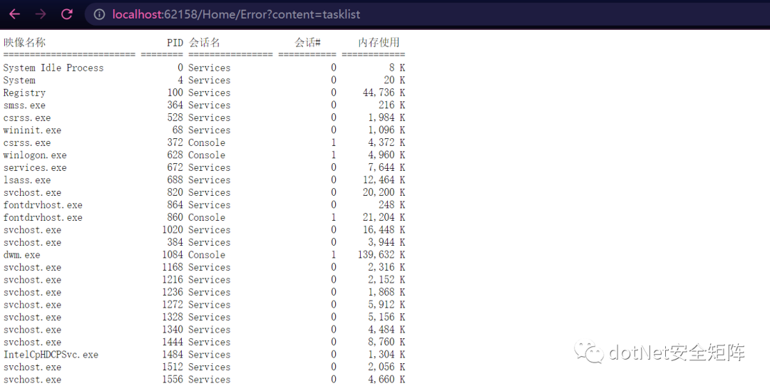 效果实现如下 请求/Home/Error?content=tasklist正常触发,成功结果如下图