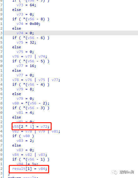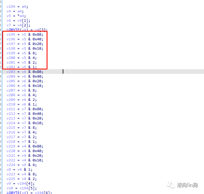 这里一堆与操作的目的就是将传入的8位分别和0x80 0x40 0x20 0x10 8 4 2 1与操作扩展至64位