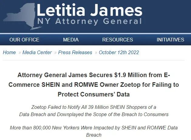 罚款是在司法部长办公室对 2018 年的一次黑客攻击进行调查后作出的,其中信用卡和个人信息,如姓名、电子邮件和哈希密码被盗。该数据泄露事件影响了 3900 万 Shein 和 700 万 Romwe 账户,包括属于纽约人的 80 多万个账户。