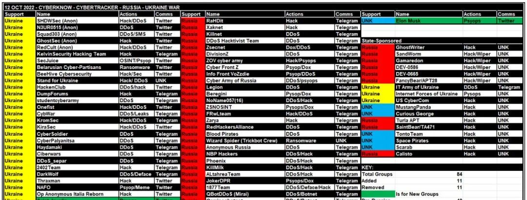 根据Cyberknow本周三的统计,全球有33个民间黑客组织和3个国家黑客组织宣布支持乌克兰: