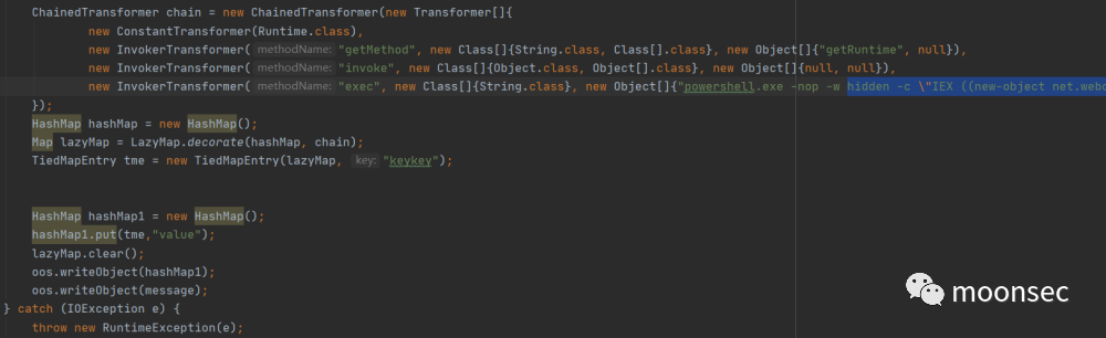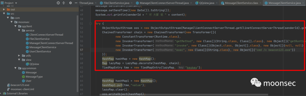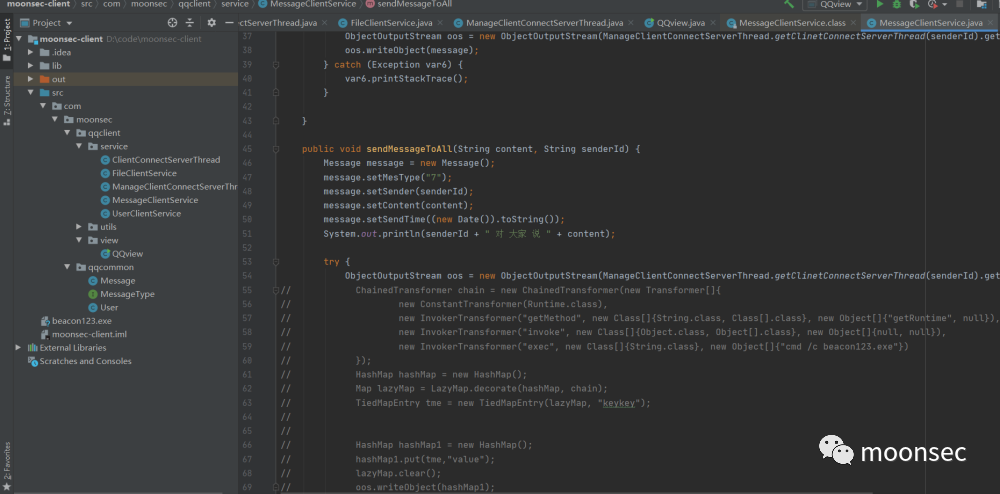 然后根据第一台靶机QQclient.jar的反编译信息新建一个项目并添加commons-collections-3.2.1.jar作为依赖包,在sendMessageToAll中添加cc6恶意对象。