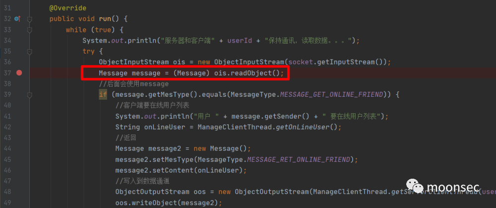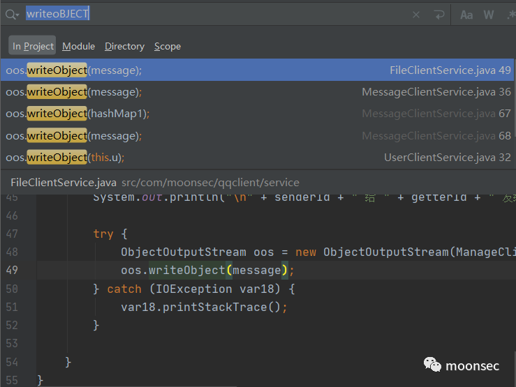 因为有过提示User类不是漏洞点,那就只有Message类了,去客户端寻找那些地方使用了wireObject(message)方法