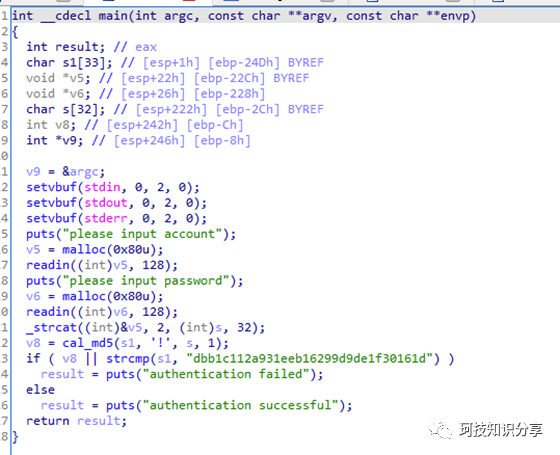这里的代码为了将v5(账户)和v6(密码)先后放在s地址合并(最大长度32),先将v5放进s,size为32-0=32,获取len为snprintf()返回的长度。再将v6放进s,size为32-len。