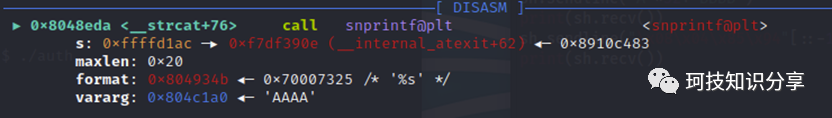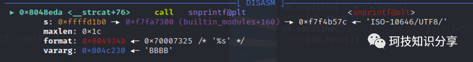 这样看起来没问题,但snprintf的返回值并不是实际打印的字符个数,而是未经过size限制的个数,也就是说len就等于v5字符串的长度,如果v5长度超过32, 32-len就变成了负数,也就是很大的一个数字,同时第一个参数s+len也可以变成高位栈上的任意地址。比如我们输入32A+BBBB/CCCC,会破坏掉一个栈,在代码执行到最后的lea esp, [ecx-4]时发生错误。