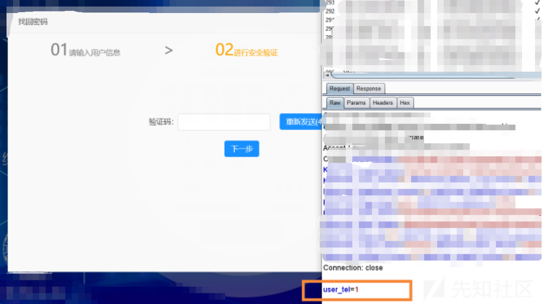 再来一次,抓包并修改响应包,将0改为1,放包后成功来到第二步,前端自动请求了一个后端接口发送验证码