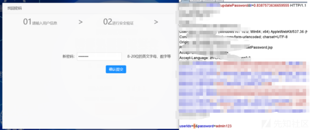 发现请求体里只有userIds和password两个参数,前者是要修改密码用户的uid,后者是新密码的值,猜测这里可能存在任意账户密码重置,而后又意识到我们传入的用户不存在,所以前端存储的userid变量为0,于是我们将请求包中userIds字段修改为1,尝试重置管理员密码。