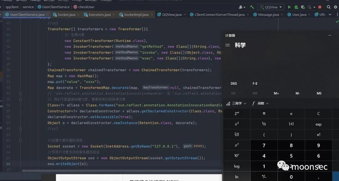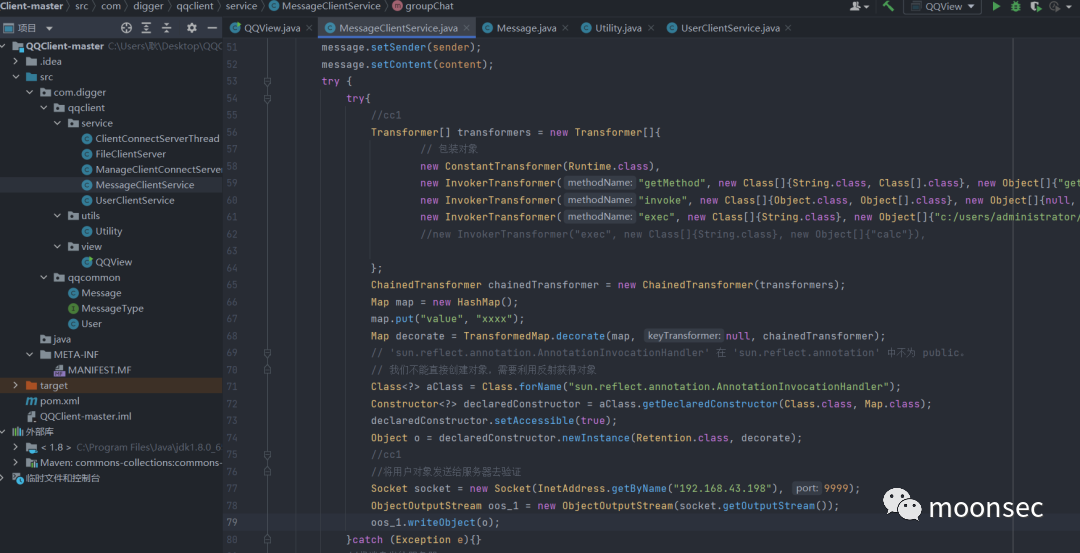 我选择在MessageClientService类的群聊方法里面执行cc1,它会将我们写入的socket流发到服务端去反序列化,这样一来我们就可以RCE了。你也可以在客户端的UserClientService的类里面直接在user对象被反序列化前执行CC1。不过这样一来就无法登录成功,不便于我们确定流量是否到达服务端,但还是可以RCE的。就像这样: