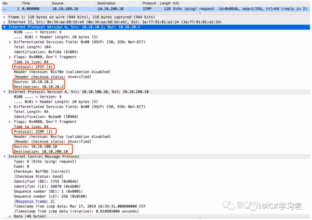 某天半夜,负责监控科来流量分析的小伙伴发现了子公司发往自己内部的攻击流量,流量中攻击特征十分明显,再一看IP地址确实也是分配给子公司的IP,上报上去之后发现有个地方解释不通,部署的各种监测设备采集的都是集团内部的流量,并没有在子公司部署探针,于是第一次发现当作误报给忽略了,后来第二天第三天还是能看到这样的流量,仔细点开一条TCP报文发现有两层的IP报文,第一层协议号为4(IPIP),第二层协议号才是实际的传输协议,代表这些是经过IPIP隧道封装后的流量。举个例子,A和B是两台服务器,服务器各自又起了一堆虚拟机,但是只给物理机分配了一个IP地址,如果我想两个服务器起的虚拟机可以通讯的话,就可以在A、B上建立IPIP隧道,将虚拟机的子网互相访问的流量承载于A和B这两个地址,这样就不用局限于地址的数量,地址段也可以随意设置。效果如下图,来源互联网: