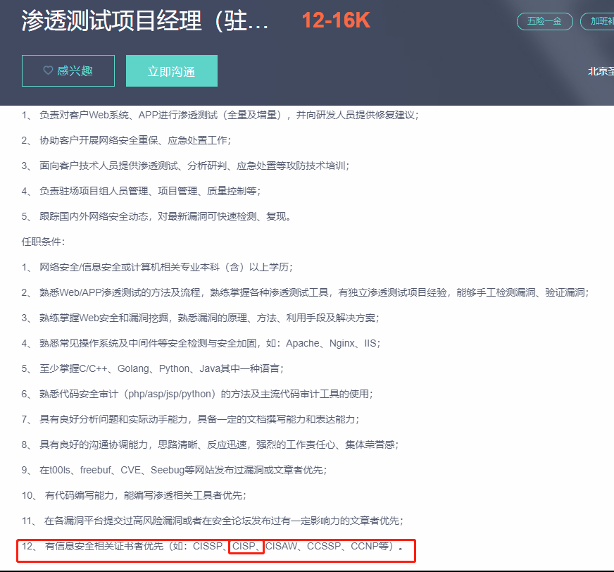 而CISP,国内权威认证,含金量很高,政府背景给认证做背书,如果想在政府、国企及重点行业从业,企业获取信息安全服务资质,参与网络安全项目,这个认证都是非常重要的。