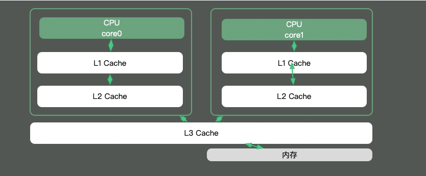 由于CPU核内存之间的速度差异是非常大的,解决方式就是加入高速缓存。其实,这些高速缓存,往往会有多层,如下图。