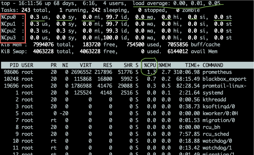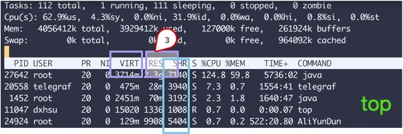 从top命令可以看到几列数据,注意方块括起来的三个区域,解释如下: