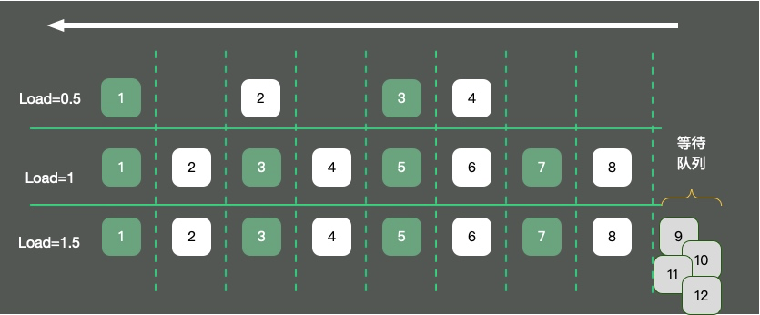 4辆,车辆畅通无阻,load大约是0.5。那load为1代表的是啥?针对这个问题,误解还是比较多的。