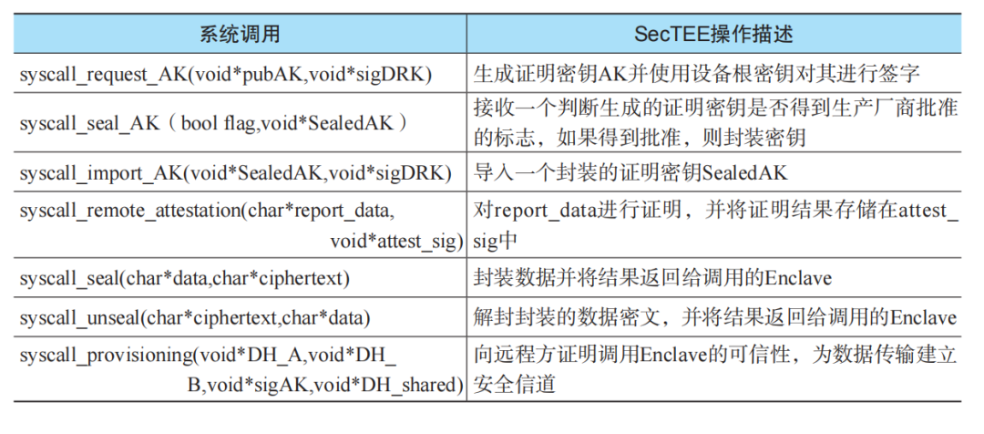 SecTEE在TEE操作系统内核层提供了平台身份证明、完整性度量、数据封装、远程证明和机密数据提供(secret provisioning)等5种基本可信计算机制。其中可信计算机制的信任根由设备根密钥(DRK)、设备封装密钥(DSK)和生产厂商的公钥(PubMRK)这3个密钥构成,不依赖其他硬件资源。平台身份证明机制基于厂商的PKI实现,用于验证Enclave开发者的身份;完整性度量机制在Enclave加载时对其完整性进行度量和验证,保证Enclave未被篡改;数据封装机制将Enclave的机密数据绑定在平台上,保证只能由指定平台和指定Enclave访问该机密数据;远程证明机制实现为一个特权Enclave,可对证明密钥进行管理,并可向远程验证方提供Enclave的完整性状态和身份的证明;机密数据提供机制基于SIGMA密钥协商协议和可信计算远程证明协议实现,可向远程数据提供方证明Enclave的完整性状态和身份,并构建安全信道,从而保证数据方安全地将私有数据传递给Enclave。上述可信计算机制实现为7个TEE操作系统调用,供Enclave调用。SecTEE系统调用如表1所示。