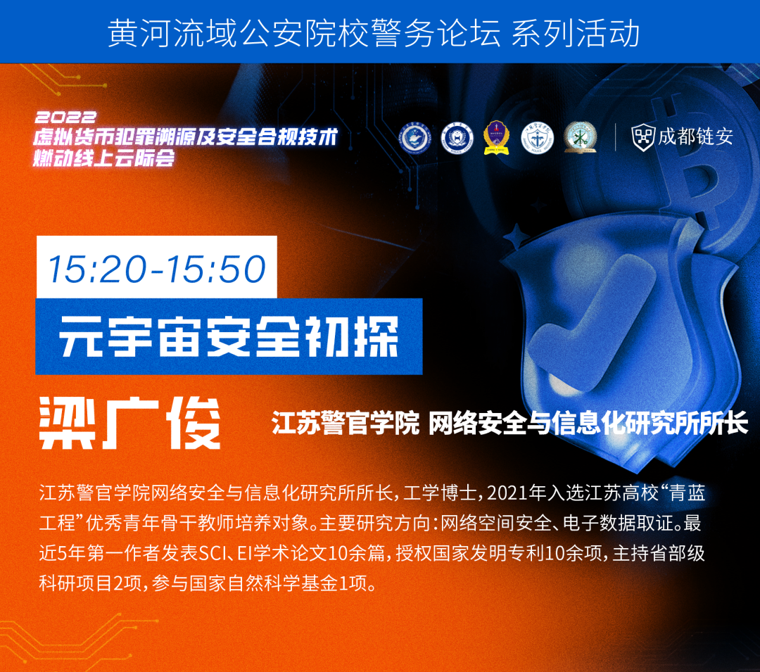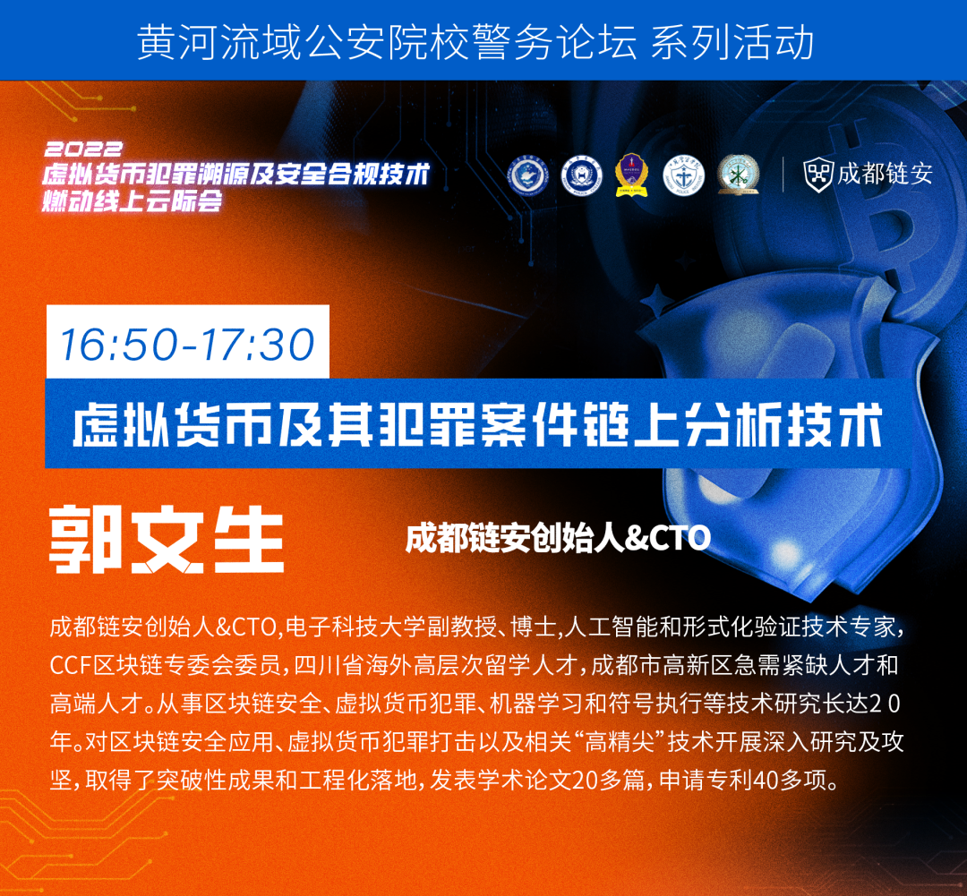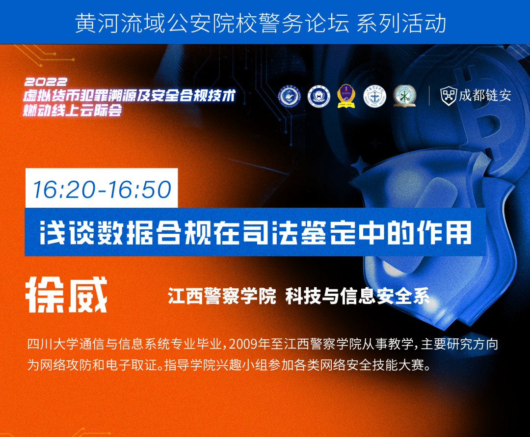 近年来,随着区块链技术的广泛应用,以比特币、以太坊等为代表的虚拟货币交易极其活跃,对市场经济秩序产生了很大的影响。同时利用虚拟货币进行的违法犯罪活动也愈演愈烈。面对涉虚拟货币这一新兴犯罪形态以及虚拟货币追踪溯源和安全合规这一新兴课题,警校学员及基层民警迫切需要掌握相关技术原理,研究案件打击策略方法,夯实基础,拓展思路。基于此,2022年10月22日 14:00-17:30(周六),由山东警察学院警务信息系主办,山东警察学院网安社承办,联合中国人民警察大学、江西警察学院、江苏警官学院、河南警察学院专家,成都链安科技有限公司作为技术支持单位,面向黄河流域公安院校以及全国其他公安院校和一线办案民警的“2022虚拟货币犯罪溯源及安全合规技术燃动线上云际会(定邀)”即将开启!本次会议嘉宾阵容强大,届时山东警察学院、中国人民警察大学、江西警察学院、江苏警官学院、河南警察学院的警校专家将带来满满的干货分享。本次会议分享的所有议题内容均已做脱敏、脱密处理,分享嘉宾介绍、分享议题以及会议议程如下: