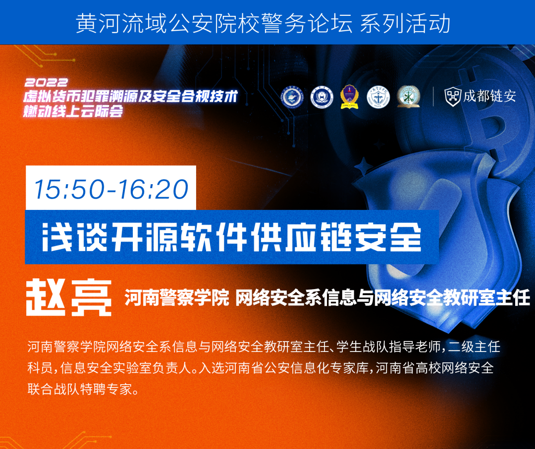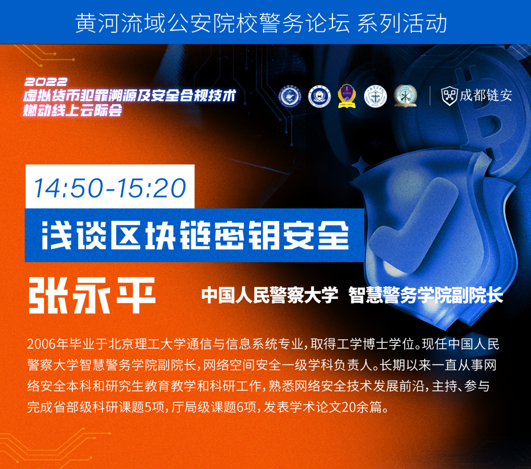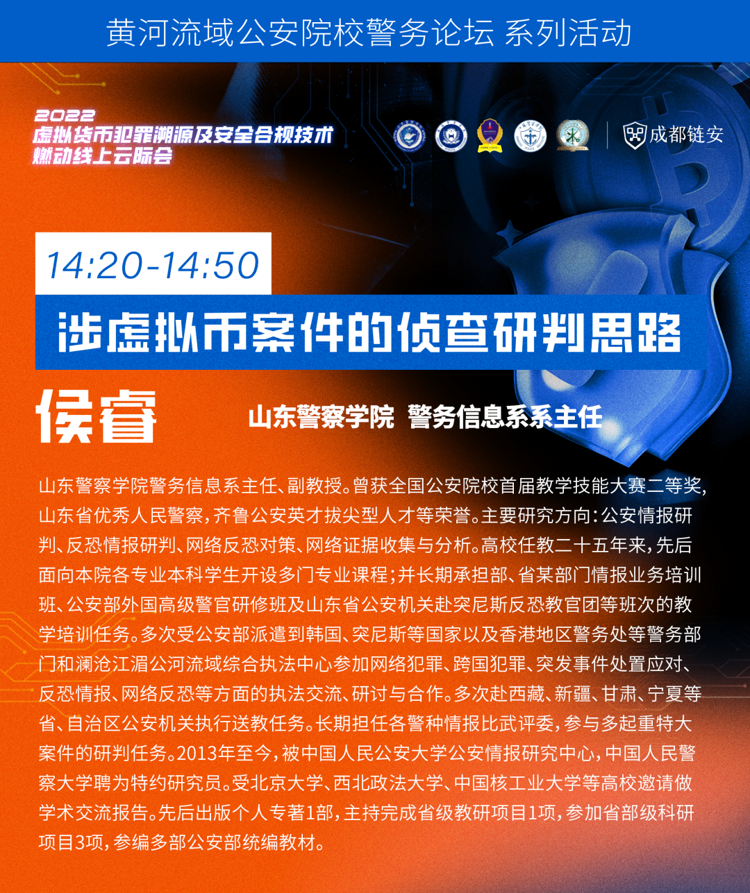 近年来,随着区块链技术的广泛应用,以比特币、以太坊等为代表的虚拟货币交易极其活跃,对市场经济秩序产生了很大的影响。同时利用虚拟货币进行的违法犯罪活动也愈演愈烈。面对涉虚拟货币这一新兴犯罪形态以及虚拟货币追踪溯源和安全合规这一新兴课题,警校学员及基层民警迫切需要掌握相关技术原理,研究案件打击策略方法,夯实基础,拓展思路。基于此,2022年10月22日 14:00-17:30(周六),由山东警察学院警务信息系主办,山东警察学院网安社承办,联合中国人民警察大学、江西警察学院、江苏警官学院、河南警察学院专家,成都链安科技有限公司作为技术支持单位,面向黄河流域公安院校以及全国其他公安院校和一线办案民警的“2022虚拟货币犯罪溯源及安全合规技术燃动线上云际会(定邀)”即将开启!本次会议嘉宾阵容强大,届时山东警察学院、中国人民警察大学、江西警察学院、江苏警官学院、河南警察学院的警校专家将带来满满的干货分享。本次会议分享的所有议题内容均已做脱敏、脱密处理,分享嘉宾介绍、分享议题以及会议议程如下: