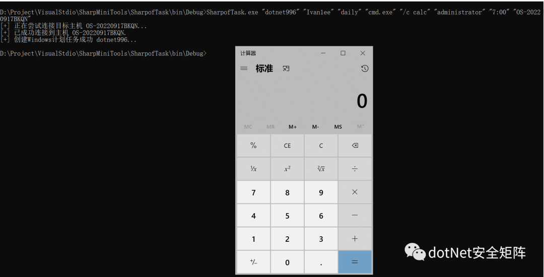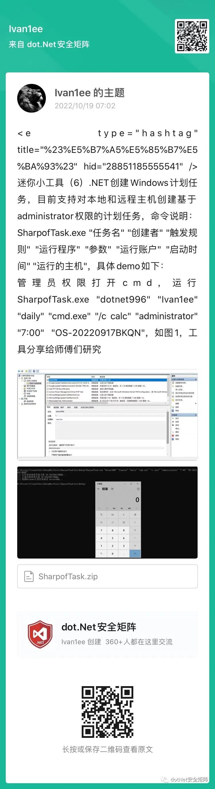 SharpofTask.exe "dotnet996" "Smile" "daily" "cmd.exe" "/c calc" "administrator" "7:00" "OS-20220917BKQN"为了更好地应对基于.NET技术栈的风险识别和未知威胁,dotNet安全矩阵星球从创建以来一直聚焦于.NET领域的安全攻防技术,定位于高质量安全攻防星球社区,也得到了许多师傅们的支持和信任,通过星球深度连接入圈的师傅们,一起推动.NET安全高质量的向前发展。星球提供50元代金劵,师傅们先到先得噢!扫描星球亮点里的二维码即可加入我们。