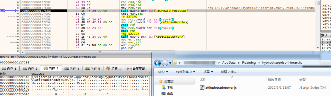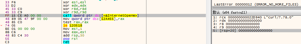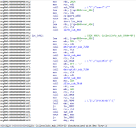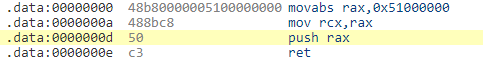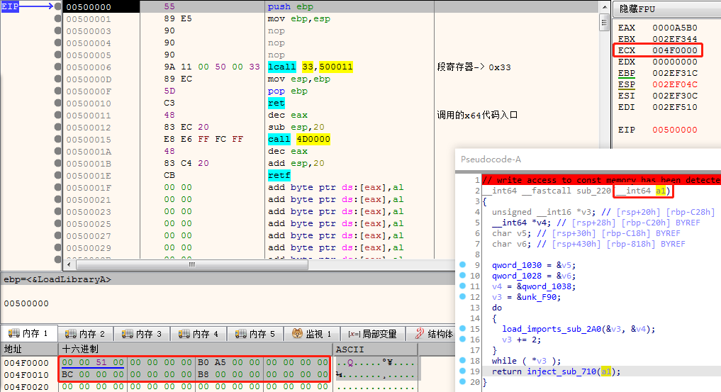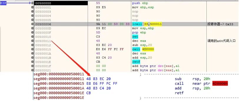 上述代码将引导执行位于0x00000000004d0000处的64位代码指令,dump该段shellcode使用ida进行x64反编译,heaven's gate跳段过程使用ecx传递一个0x20字节的参数。
