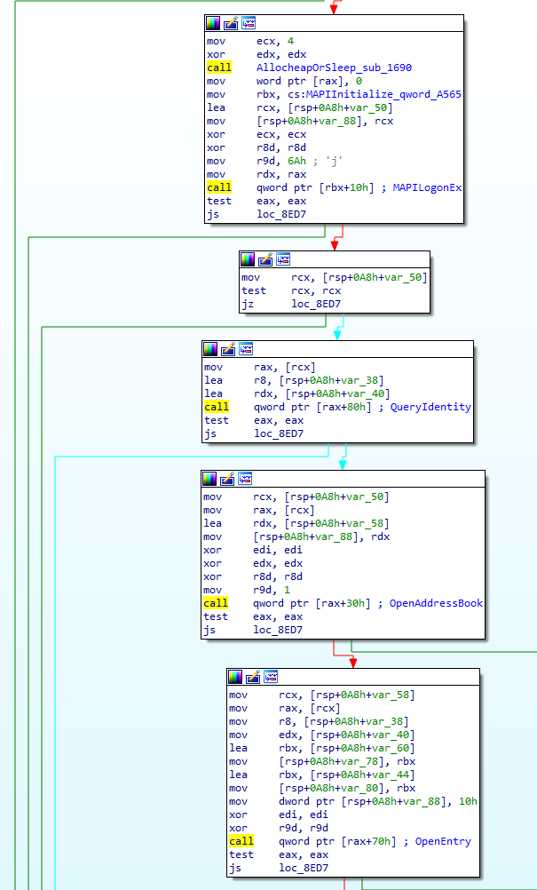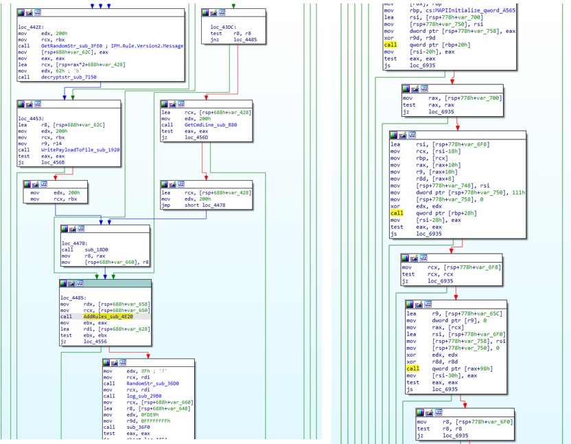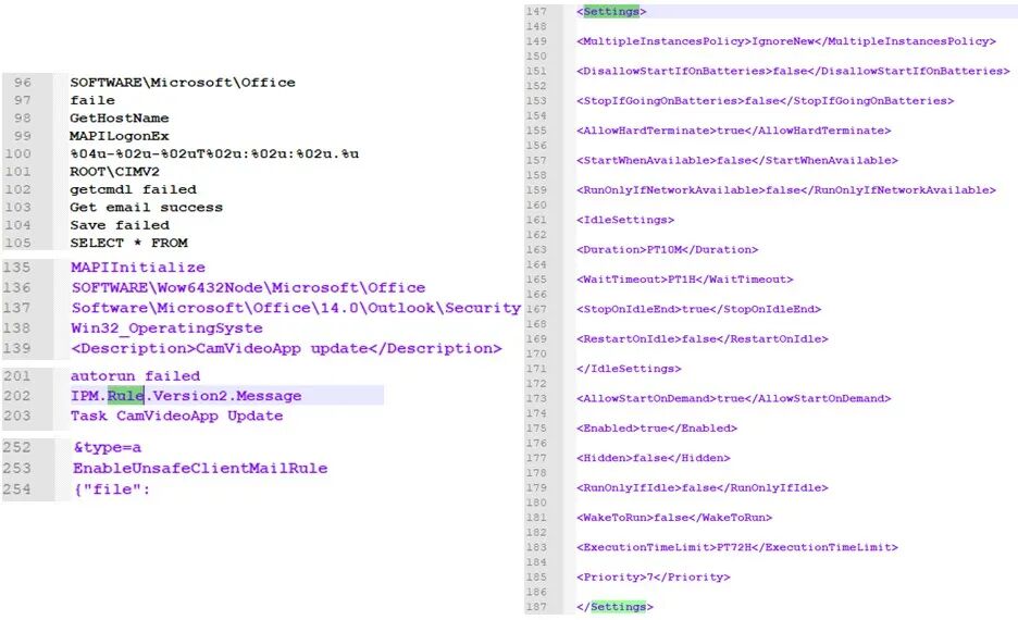 Malwarebytes在对该样本分析中提到,该木马还可提供邮件规则修改功能,代码实现与GitHubXRules项目(https://github.com/FSecureLABS/XRulez)存在相似之处。通过修改邮件规则可实现针对特定邮件的定向处理或执行恶意文件,攻击者理论上可通过outlook客户端实现持久化驻留。疑似outlook规则添加代码如下: