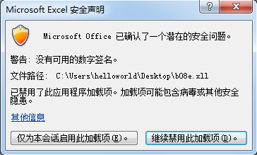 Excel加载xll后,会根据定义的xll接口调用xll文件的导出函数。其中两个接口函数很突出:xlAutoOpen和xlAutoClose。一旦加载项被激活或停用,这些函数就会分别被调用。这些函数可用于加载恶意代码,类似于经典VBA宏中的Auto_Open和Auto_Close方法。xll文件的一个缺点是它们只能由Excel以正确的位数加载。例如,64 位 XLL 只能由 64 位版本的Excel加载。32 位版本也是如此。因此,恶意软件作者必须依赖安装在受害者机器上的 Excel 版本。与VBA宏一样,Excel将警告用户执行加载项引起的安全问题。在这方面,与VBA宏相比,它对恶意软件没有优势。