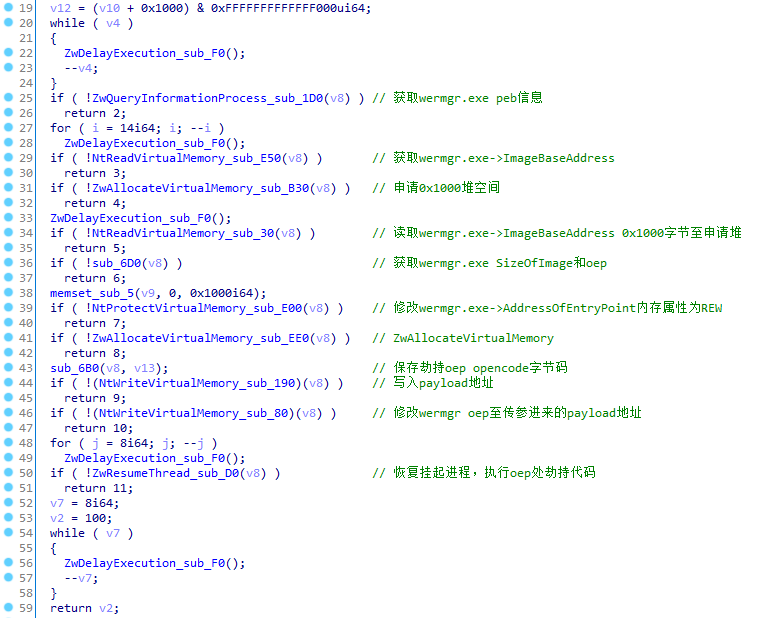 dump分析0x00000000004d0000处的shellcode,其逻辑如下,将lpdiystruct->lppayload拷贝至wermgr.exe空间,然后修改劫持wermgr.exe->AddressOfEntryPoint执行注入的shellcode。