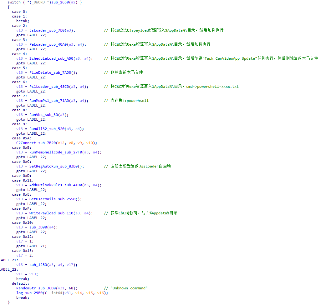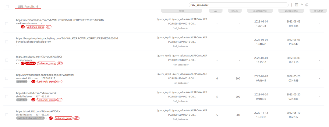 JssLoader是FIN7经常使用的一款集信息收集、多类型插件下载/加载功能于一体的中期渗透插件,样本分析过程中提及的形如“id=WALKERPCWALKERPC&type=a”的uri参数以及用户和主机信息收集功能实现中用到的json格式中的名称元素字符串等与历史事件完全一致,都可以作为归因至FIN7的强关联证据,此部分不展开描述。