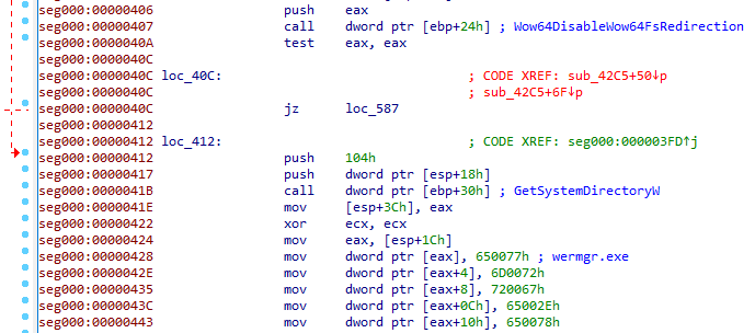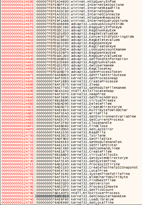 继续分析注入wermgr.exe的shellcode。注入shellcode先加载所需dll模块及其导出函数地址。
