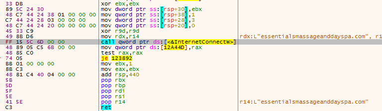 进行C&C上线,User Agent :curl/7.78.0,essentialsmassageanddayspa.com:443。若企业建设了微步OneDNS,所有域名通信前都会经过OneDNS过滤一次威胁情报,C&C反连将会被及时拦截,有效阻断了控制主机命令下发,防止了危害真实发生。