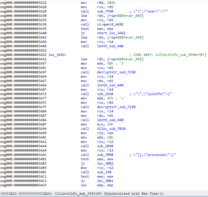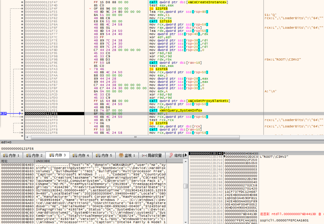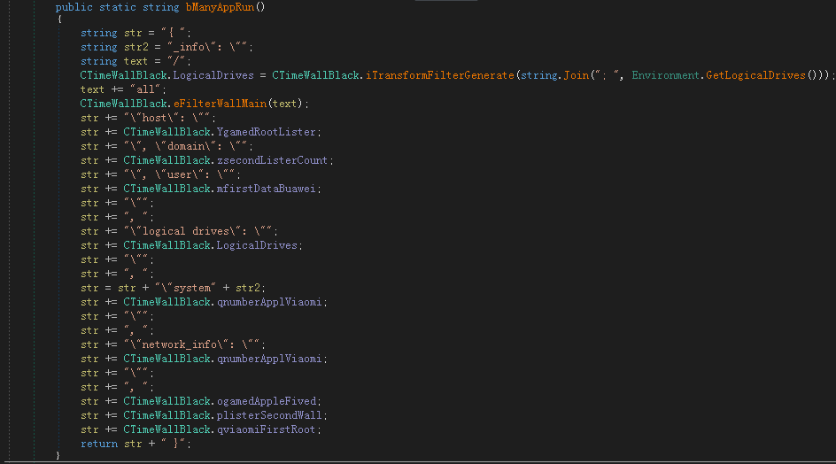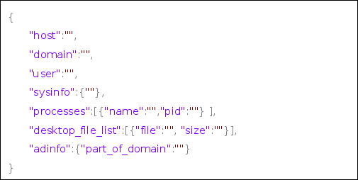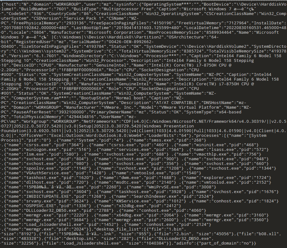 可通过附录DiyBase64Decode.py进行base64解码。收集主机及用户信息,封装成Json格式,然后进行base64编码,用于C&C上线。
