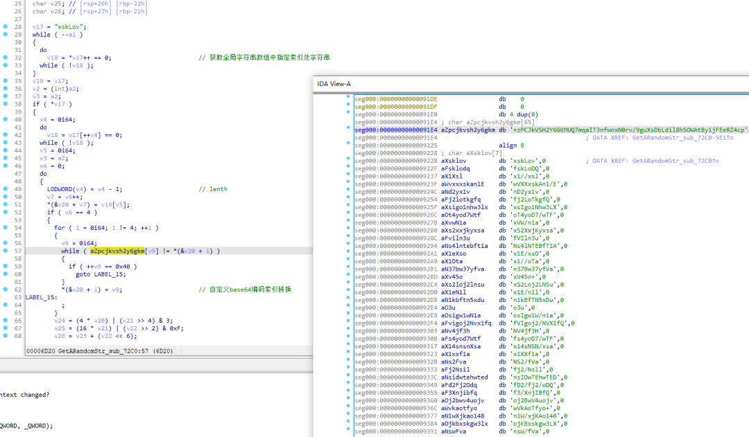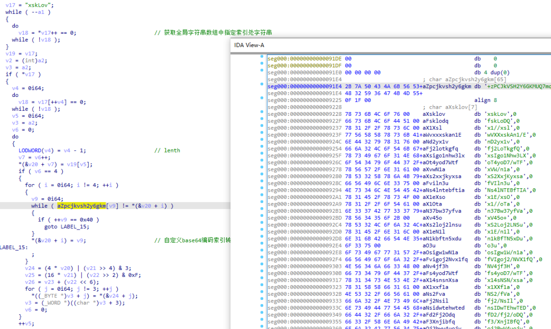 其中频繁使用的字符串解密函数如下,该函数通过传入一个索引值,在全局的字符串数组中获取索引位置的字符串,然后通过自定义base64算法进行解码(base64_list="+zPCJkVSH2Y6GKMUQ7mqaIT3nfwoxN0rv/9guXsDbLdil8h5OWAtBy1jFEeRZ4cp")。