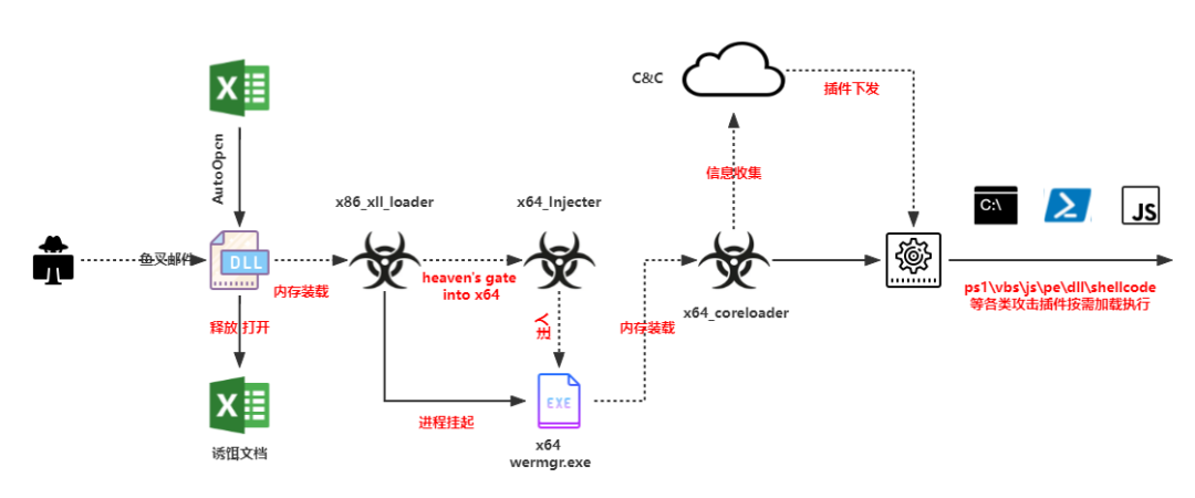 攻击者鱼叉邮件投递的xll载荷由Excel进程默认加载,xll!xlAutoOpen内存装在执行第一段shellcode(x86_xll_loader),然后挂起64为位系统进程wermgr.exe,通过天堂之门技术在32位Excel进程中内存执行x64shellcode(x64_Injecter),x64_shellcode进一步将最终的核心载荷(x64_coreloader)注入wermgr.exe,然后恢复挂起进程执行。x64_coreloader收集用户及主机信息C&C上线,请求执行C&C下发的功能插件,可支持ps1\vbs\js\exe\dll\shellcode等多种类型载荷加载,可支持不落地内存执行。整体执行流程如下图所示: