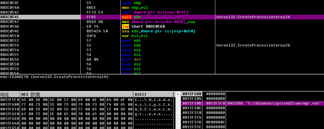 通过硬编码写入wermgr.exe->AddressOfEntryPoint,劫持wermgr.exe执行堆中ret_addr处的注入代码。