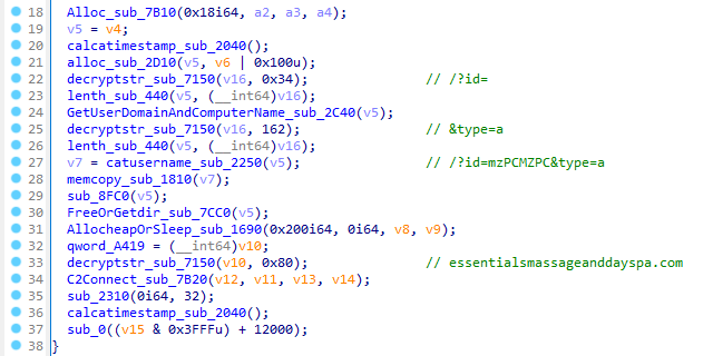 C&C交互之前,先解密uri参数及C&C地址。解密的参数用于标识中马主机身份,形如/?id=userdomain+username&type=a,其中userdomain为主机所属域名称,username为用户名称。
