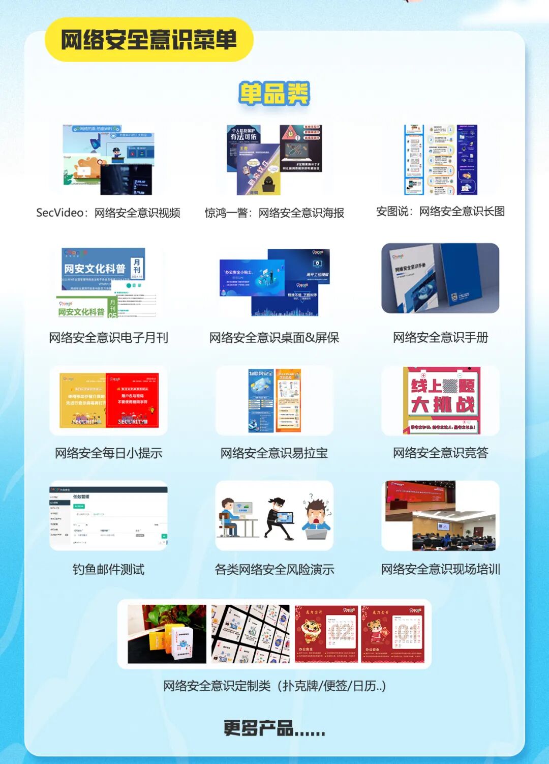 推进网络安全文化建设,对于政企单位的持续发展和长治久安具有至关重要的作用。承制科技专注于网络安全“人的因素”,可以为政企单位提供涵盖日常宣贯、宣传月、宣传周、宣传日等活动传播在内的全方位、定制化的网络安全宣传教育方案和个性化产品及服务,欢迎咨询合作。