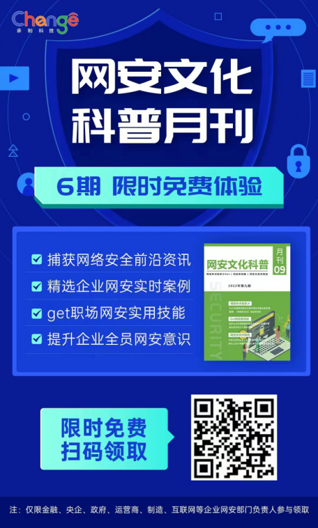 提升全员网安意识,助力企业网安建设,网安科普月刊免费体验,扫码即可申请!