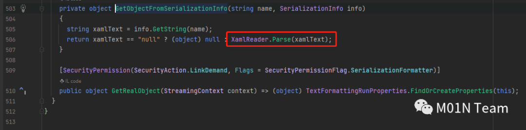 跟进GetObjectFromSerializationInfo(),看到了什么?XamlReader.Parse()!至此就衔接上了ObjectDataProvider的xaml_payload,这部分在前面.NET反序列化利用链萌新入门——XmlSerializer有过介绍。