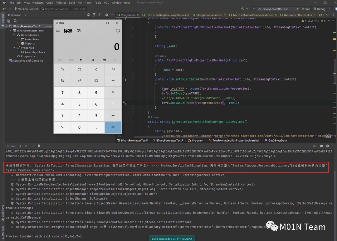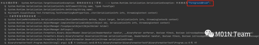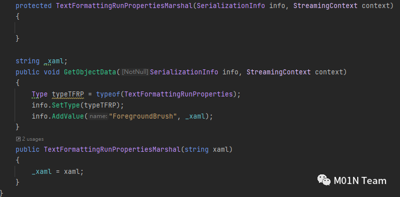 实现ISerializable接口-->在GetObjectData序列化时给ForegroundBrush字段赋值为xaml的payload,并且将对象类型赋值为TextFormattingRunProperties类-->在反序列化时触发反序列化构造函数GetObjectFromSerializationInfo-->反序列化构造函数触发XamlReader.Parse(payload) RCE