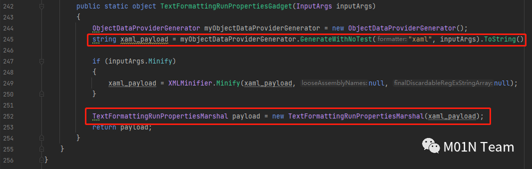 我们看一下ysoserial是如何生成TextFormattingRunProperties的payload的,代码在TextFormattingRunPropertiesGenerator.cs中。242行的TextFormattingRunPropertiesGadget()中可以看到生成了一个xaml_payload,并将其传入TextFormattingRunPropertiesMarshal(xaml_payload)从而获取最终的payload。
