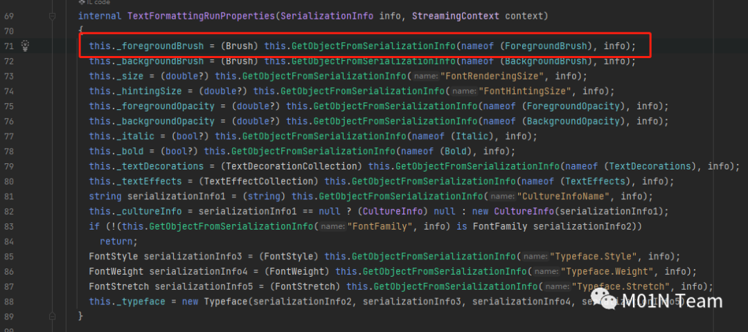 为什么是ForegroundBrush?我们可以跟入TextFormattingRunProperties看一下。在序列化函数中,执行了this.GetObjectFromSerializationInfo(nameof (ForegroundBrush), info)。