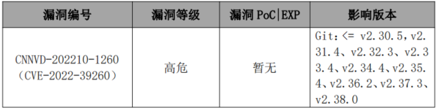 近日,嘉诚安全监测到CNNVD官方发布了Git Shell 任意代码执行漏洞的安全风险通告,漏洞编号为:CNNVD-202210-1260(CVE-2022-39260)。