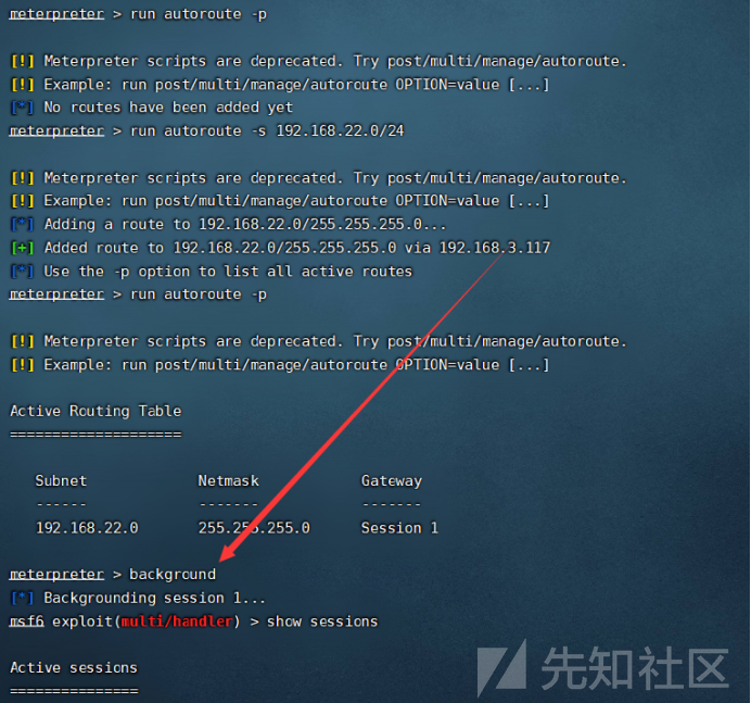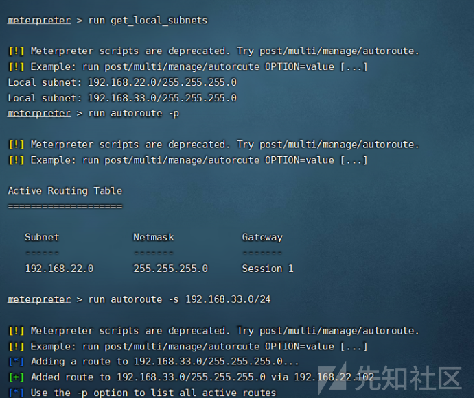 获取网络接口:run get_local_subnets查看路由地址:run autoroute -p添加路由地址:run autoroute -s 192.168.22.0/24